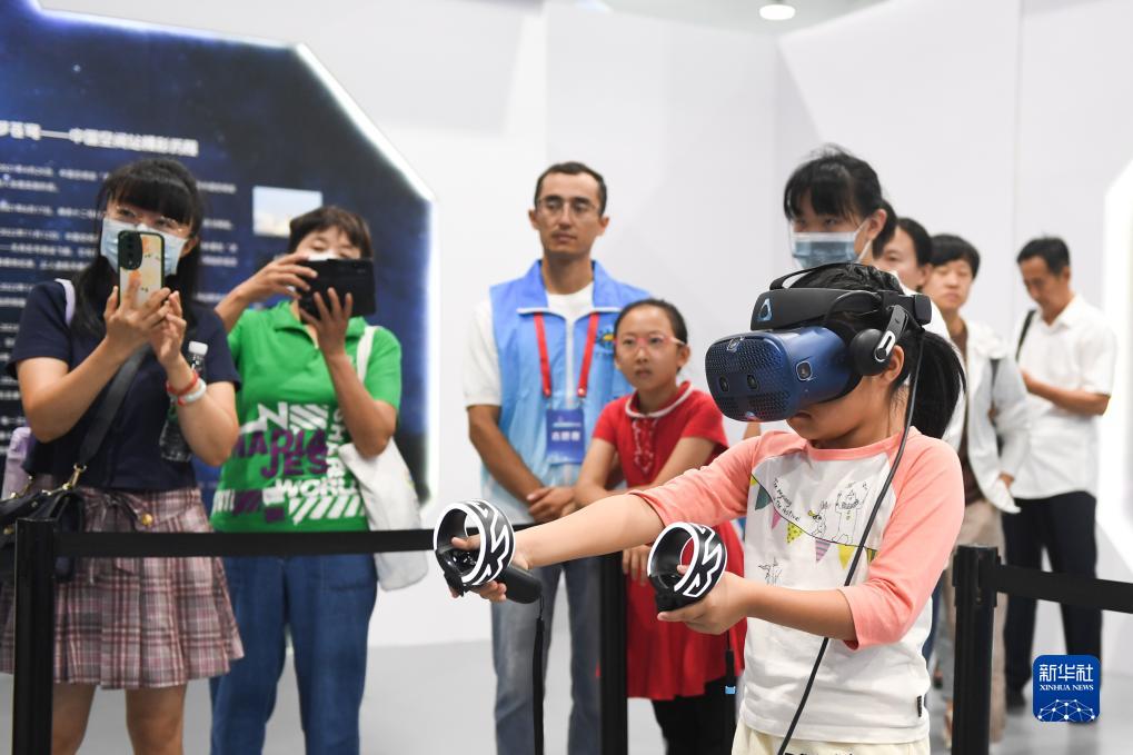 9月17日,在全國科普日北京主場活動展區,小朋友使用虛擬現實設備感受天和核心艙內的生活。