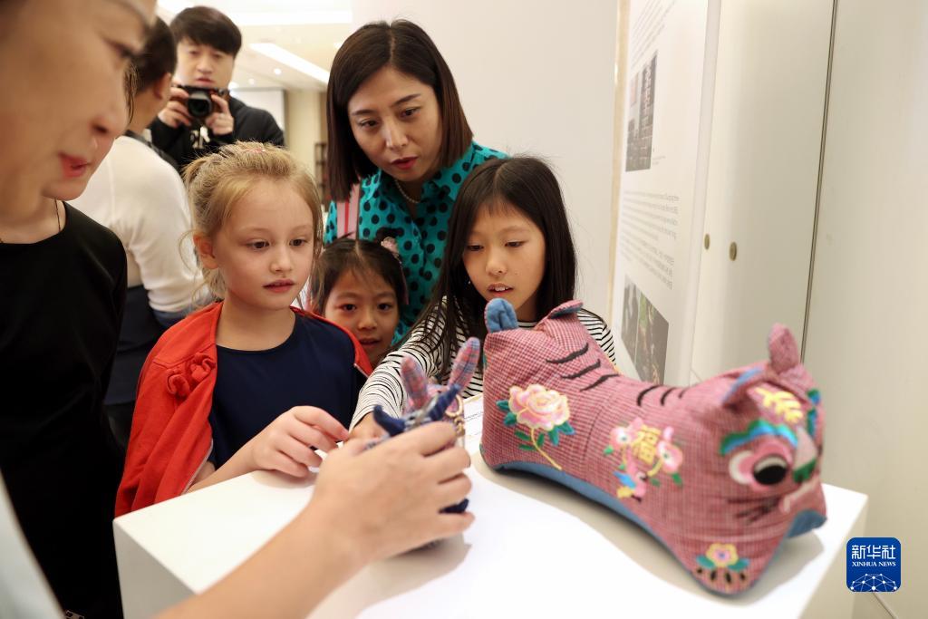 9月16日,小朋友在比利時布魯塞爾的中國使館開放日活動上參觀土布玩偶。