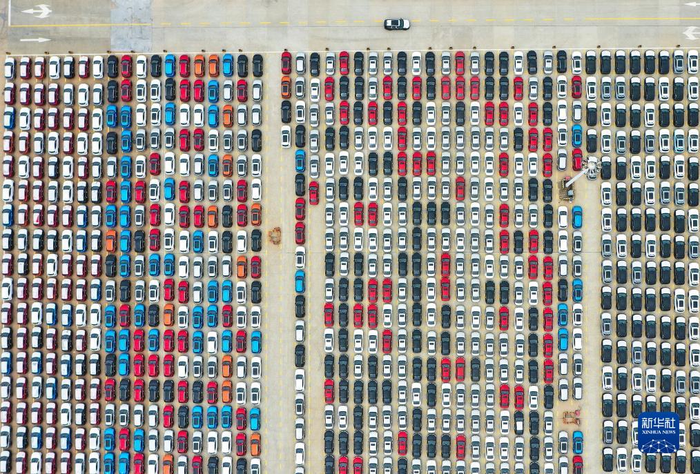 9月16日,在連雲港港滾裝碼頭,汽車排列整齊,等待發運(無人機照片)。