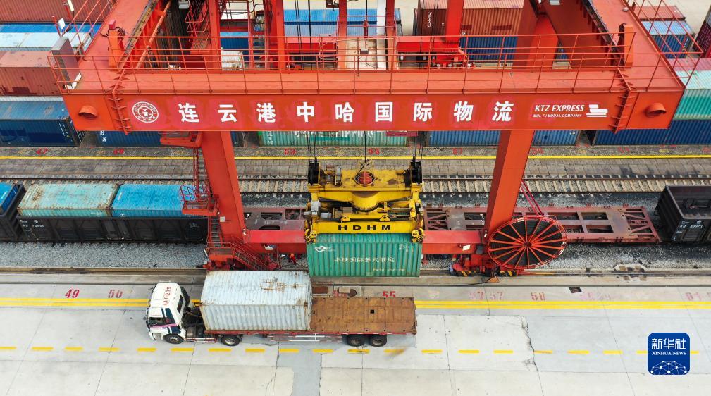 9月16日,在位於江蘇連雲港的中哈連雲港物流合作基地,龍門吊在進行卸車作業(無人機照片)。