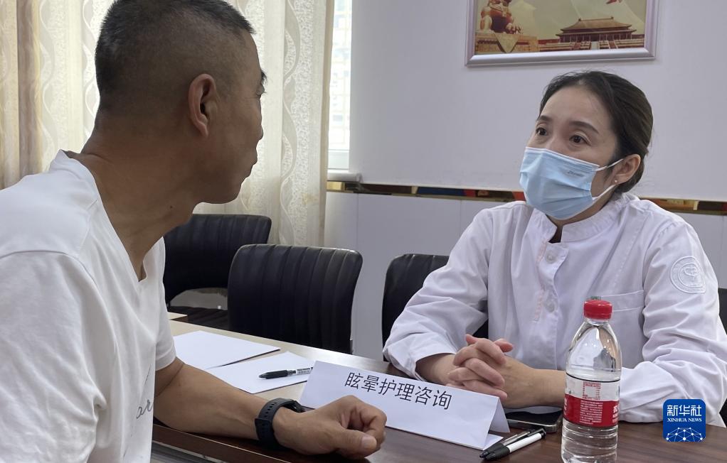 9月17日,北京友誼醫院耳鼻咽喉頭頸外科中心的護士長苑黎娜(右)與患者交流。