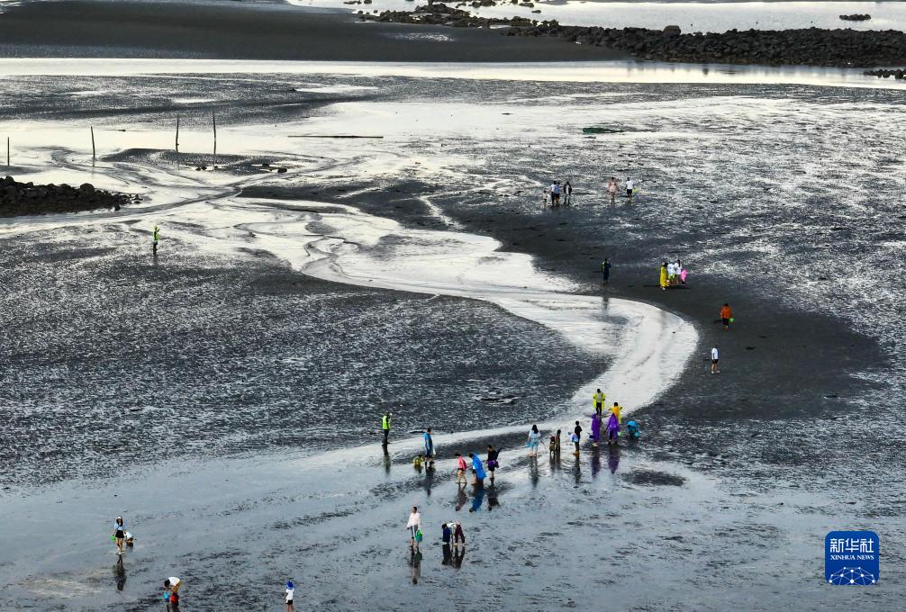 9月16日,游客在啟東“十里海灣”灘塗上游玩(無人機照片)。