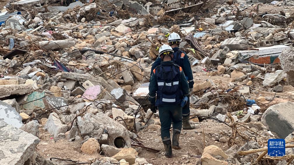 9月17日,國際救援人員在利比亞德爾納的建築廢墟上工作。