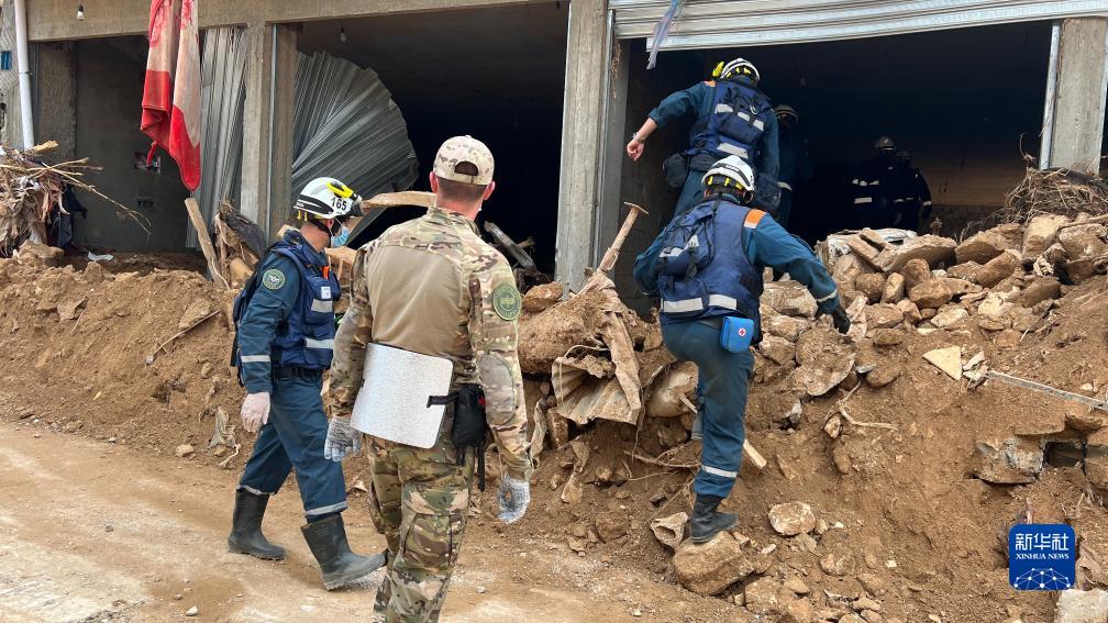9月17日,國際救援人員在利比亞德爾納的建築廢墟上工作。