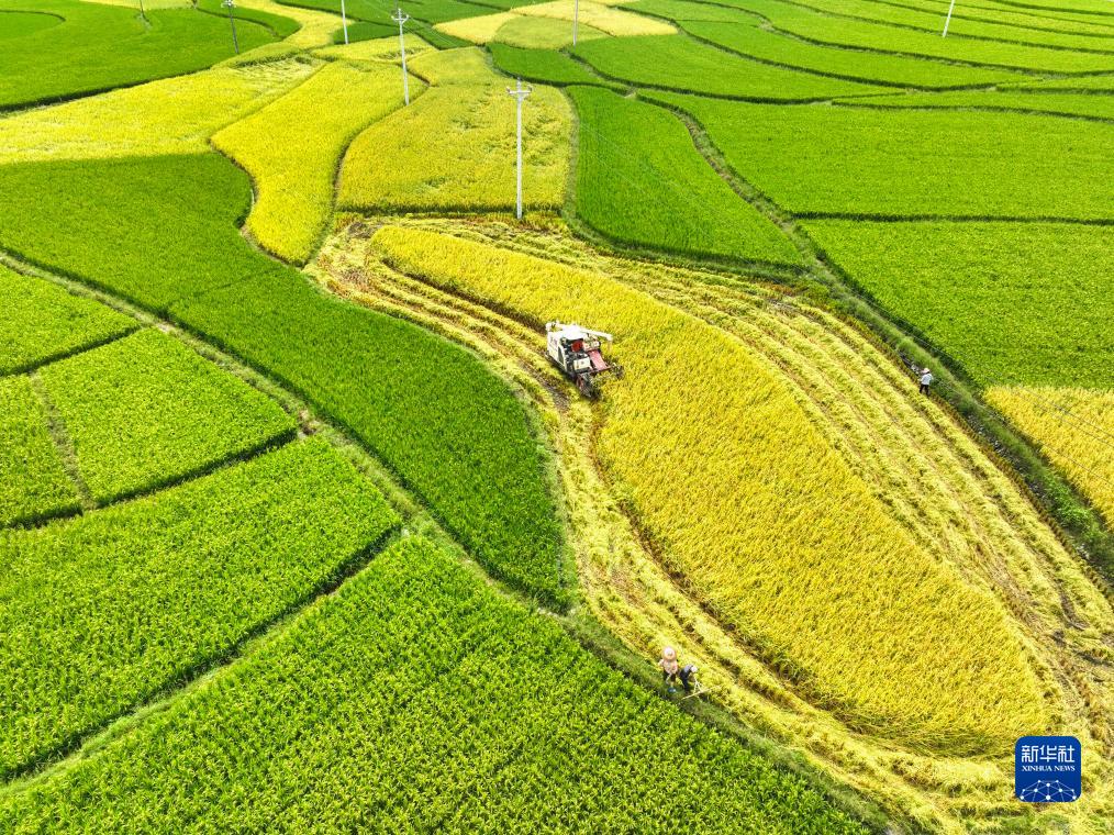9月16日,湖南省郴州市桂陽縣流峰鎮農民駕駛收割機在收割水稻(無人機照片)。