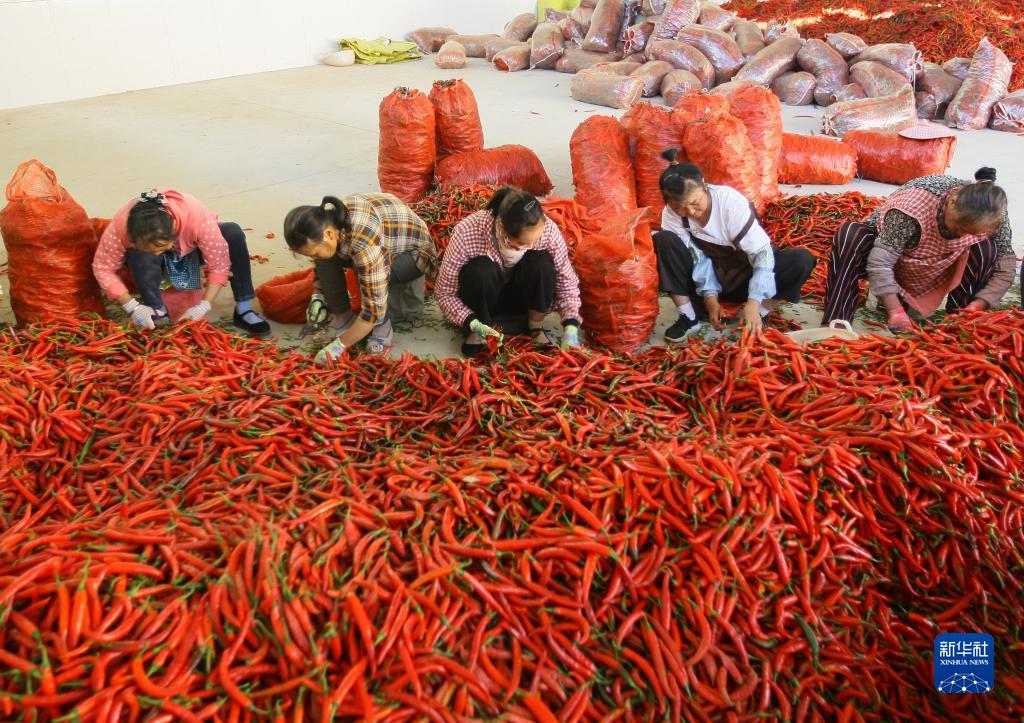 9月17日,在雲南省曲靖市沾益區金龍街道新海社區的辣椒收購點,務工人員分揀辣椒。