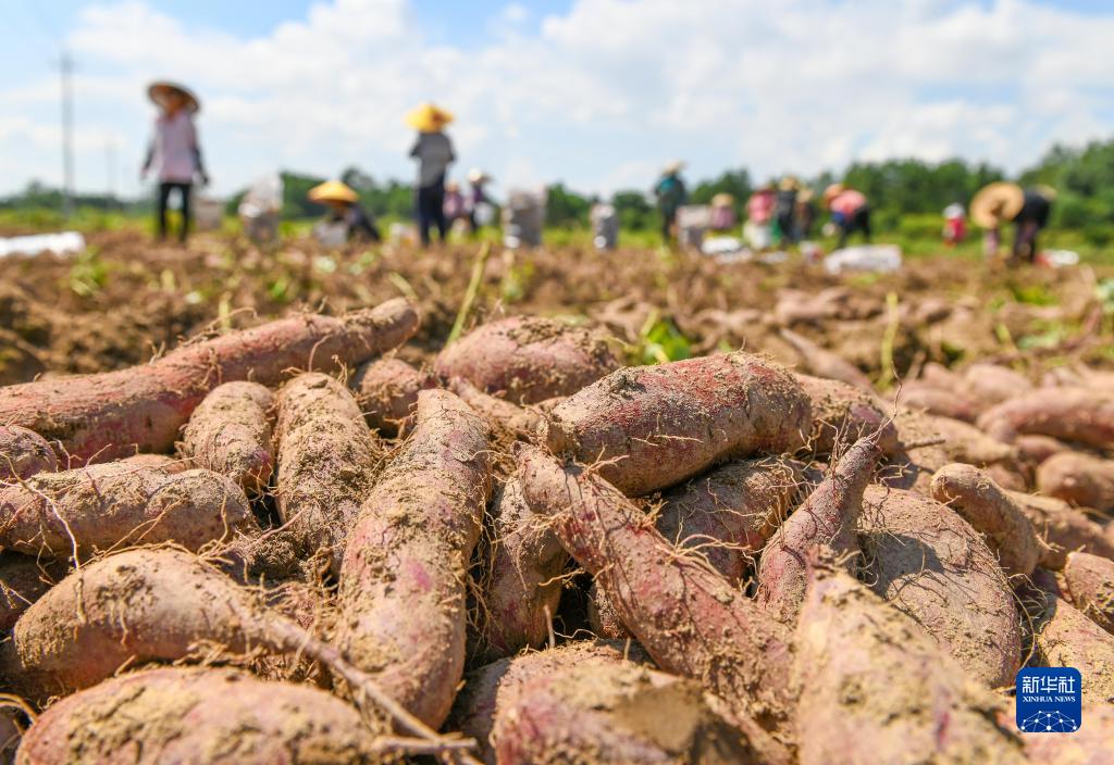 9月18日,在湖南省永州市道縣富塘街道大福社區,村民在收穫紅薯。