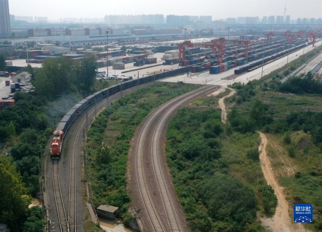 9月17日,X8202次中歐班列(鄭州)駛出國鐵集團鄭州局圃田車站(無人機照片)。