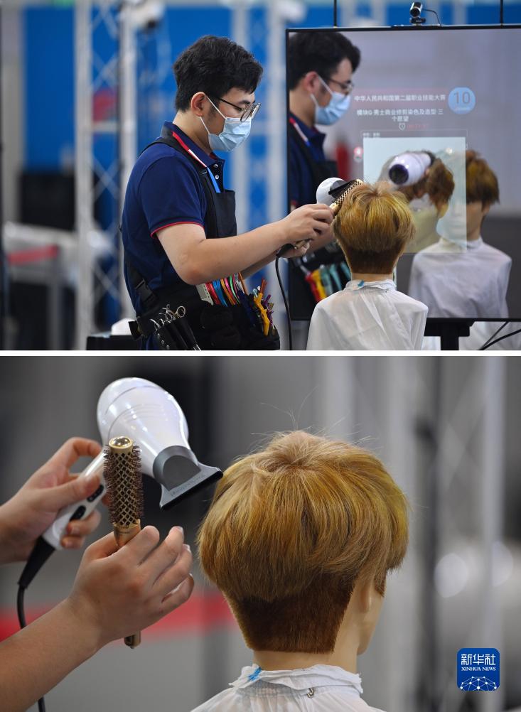 9月18日,選手在國家會展中心(天津)參加美發項目的比賽(拼版照片)。