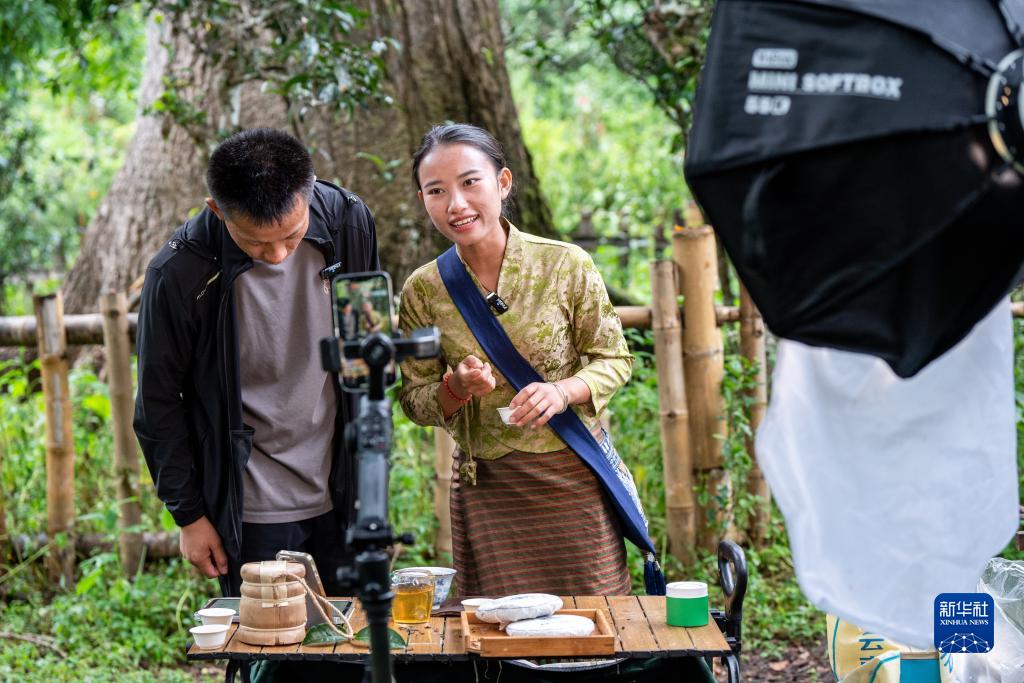 在景邁山大平掌古茶林,傣族姑娘仙金(右)在直播售賣普洱茶(9月17日攝)。