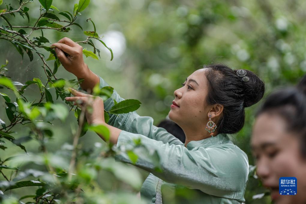 在景邁山大平掌古茶林,傣族姑娘月怕仙在採摘茶葉(9月14日攝)。