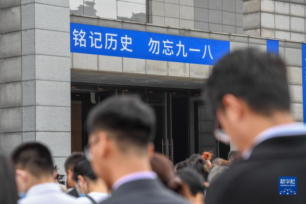 9月18日,在東北淪陷史陳列館,人們低頭默哀,緬懷在抗日戰爭中犧牲的革命先烈和死難同胞。