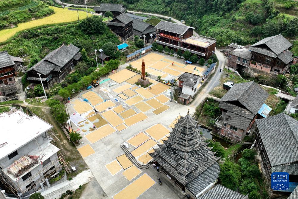 9月18日,在湖南省懷化市通道縣坪坦鄉下盤古侗寨,村民在鼓樓邊晾曬稻穀(無人機照片)。