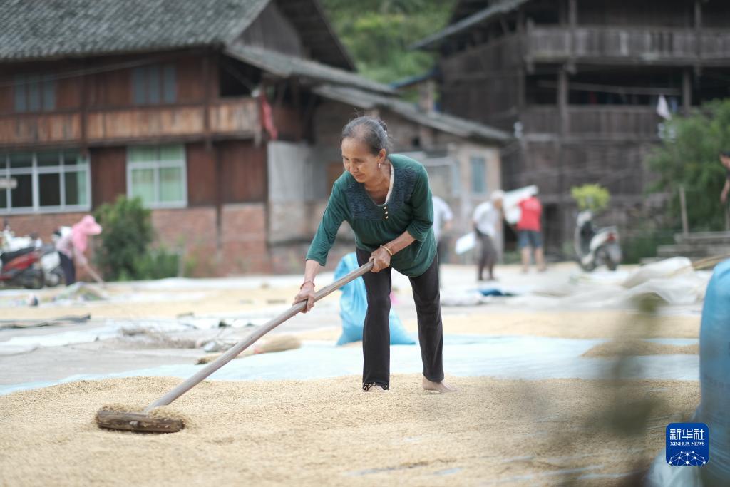 9月18日,在湖南省懷化市通道縣坪坦鄉下盤古侗寨,村民在鼓樓邊晾曬稻穀。