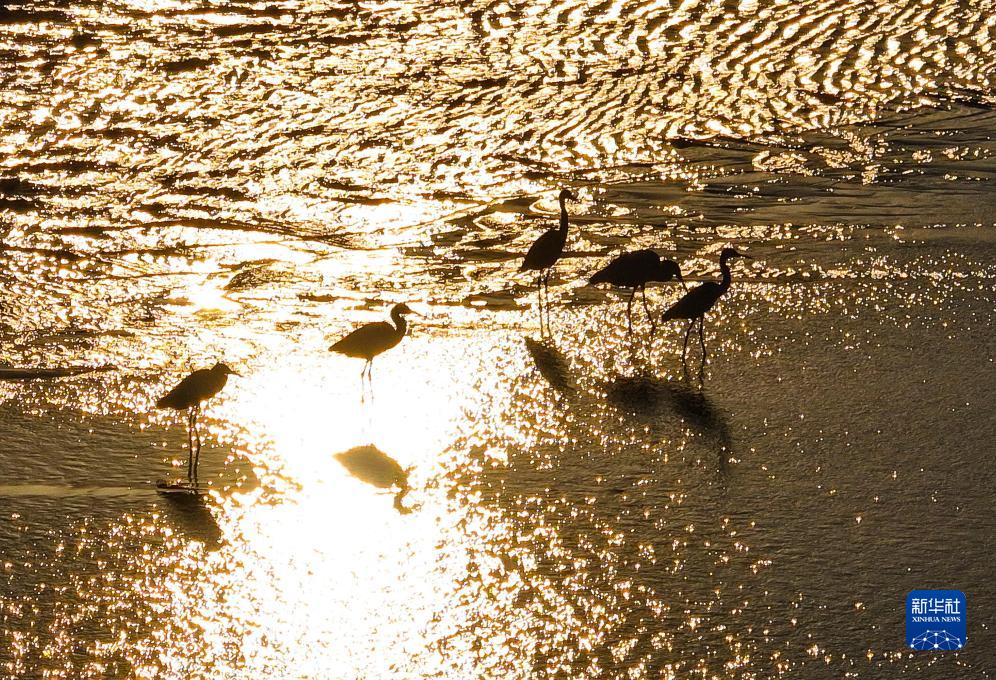鳥兒棲息在鹽城東&條子泥濕地灘塗(2023年9月1日攝,無人機照片)。