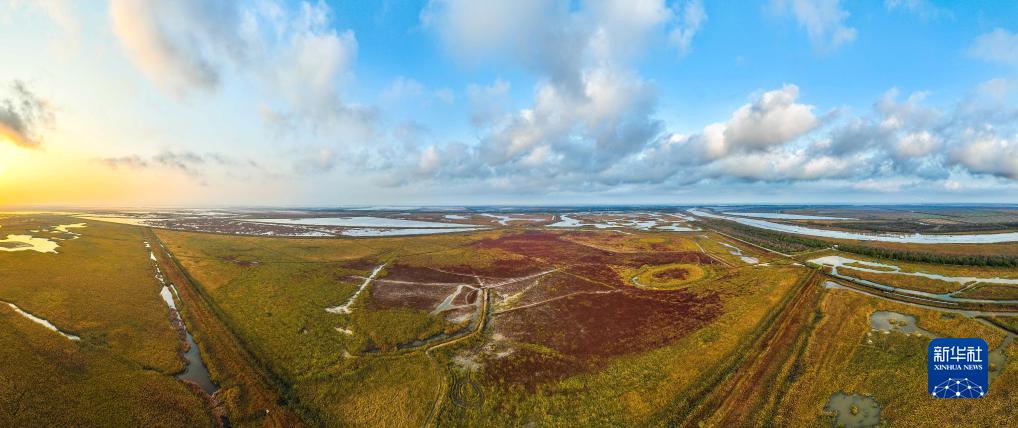晨曦中的鹽城濕地珍禽國家級自然保護區景色(2022年11月8日攝,無人機照片)。