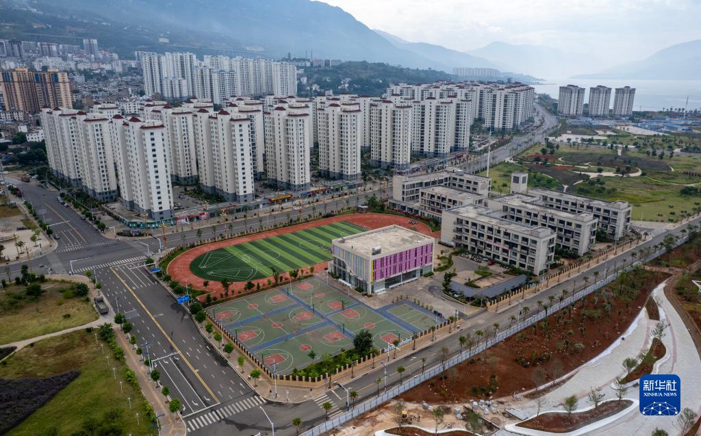 這是9月18日拍攝的位於巧家縣城的白鶴灘水電站移民搬遷安置樓房及配套的立鶴小學(無人機照片)。