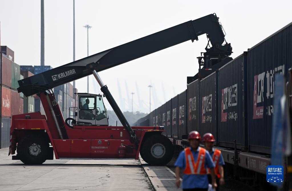9月18日,在天津港物捷三堆場,一列發往蒙古國烏蘭巴托的中歐(中亞)班列進行集裝箱吊裝作業。
