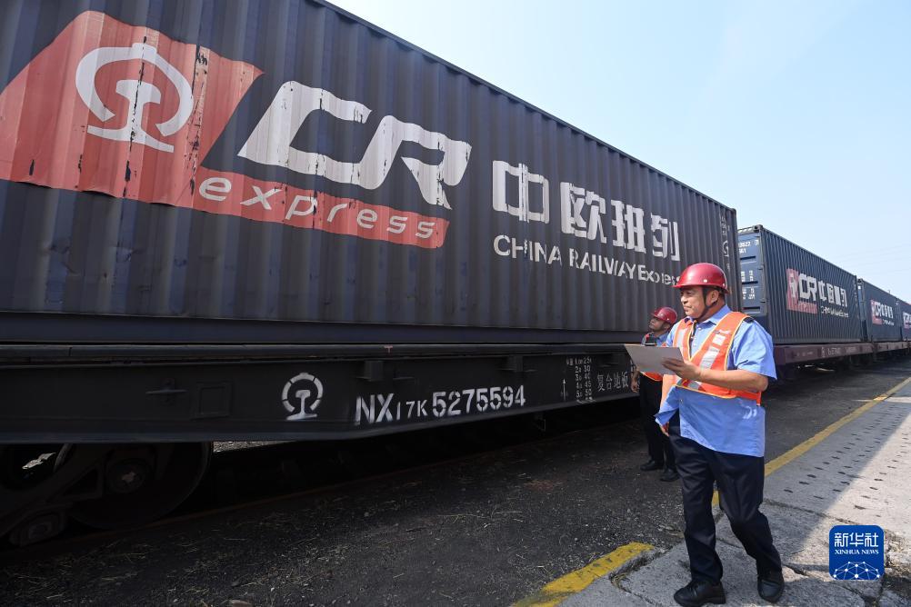 9月18日,在天津港物捷三堆場,工作人員在檢查發運前的一列中歐(中亞)班列。