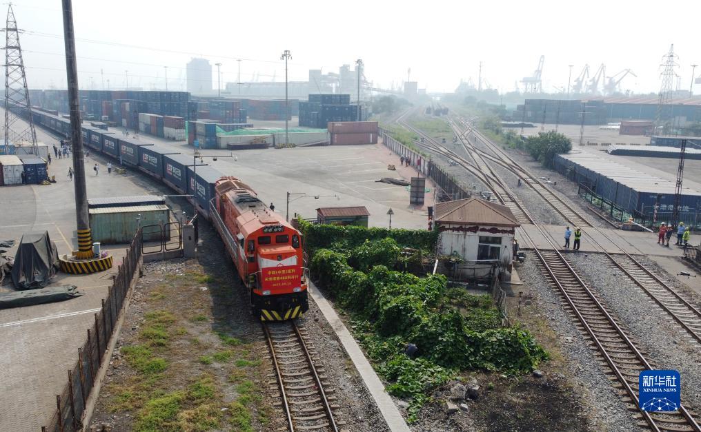 9月18日,一列發往蒙古國烏蘭巴托的中歐(中亞)班列駛出天津港物捷三堆場(無人機照片)。