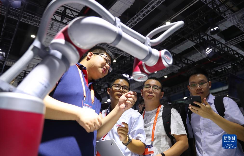 9月19日,工作人員(左)與參觀者在一個進行作業演示的機器人展品旁交流討論。