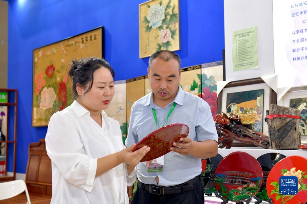 9月19日,在菏澤國際會展中心,觀眾在了解漆器産品。