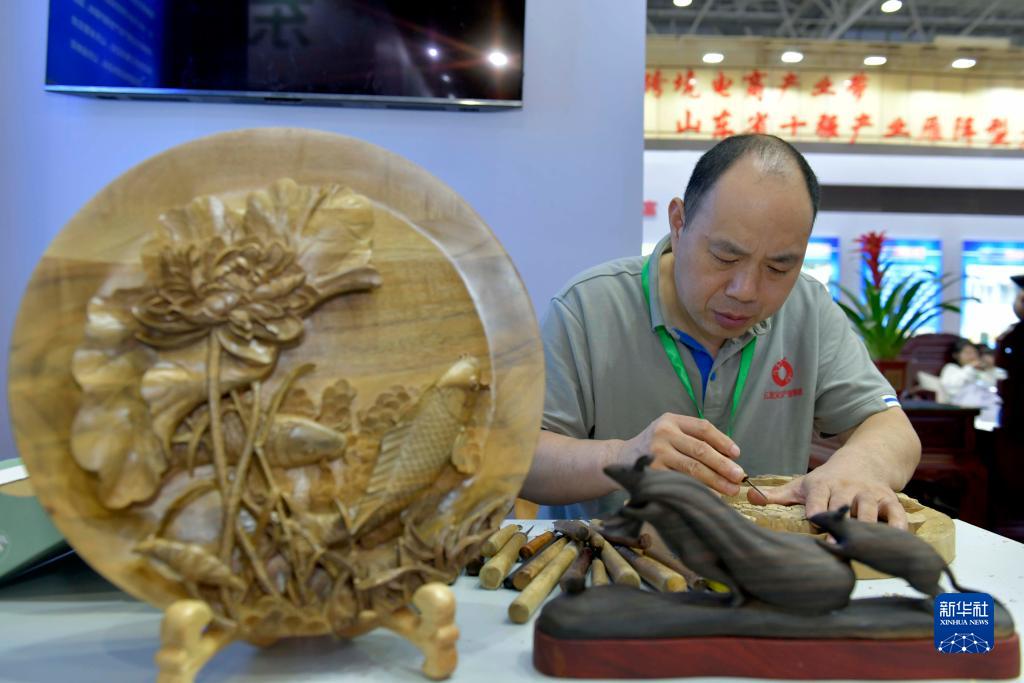 9月19日,在菏澤國際會展中心,一名男子在展示木藝雕刻。
