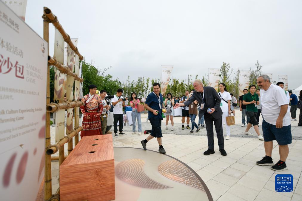 9月19日,敘利亞導演納傑達·伊斯梅爾·安佐爾(前右二)在活動現場體驗“扔沙包”。
