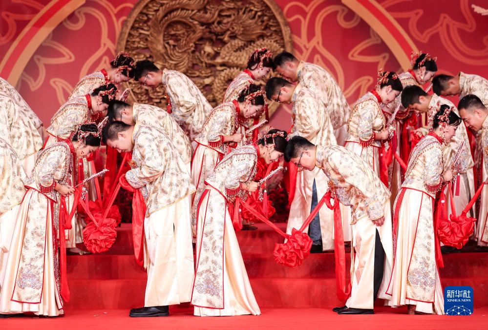 當日,在成達萬(成都經達州至萬州)高速鐵路四川省蓬安縣燕山寨隧道口的施工工地,來自中鐵三局五公司各建設工地的38對新人,身着中國傳統婚禮服飾參加集體婚禮。