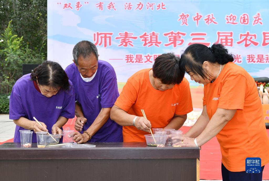 當日,河北省滄州市肅寧縣師素鎮舉辦農民趣味運動會,人們通過參與運花生、貼辣椒、豆類分揀等趣味運動項目,慶祝豐收。