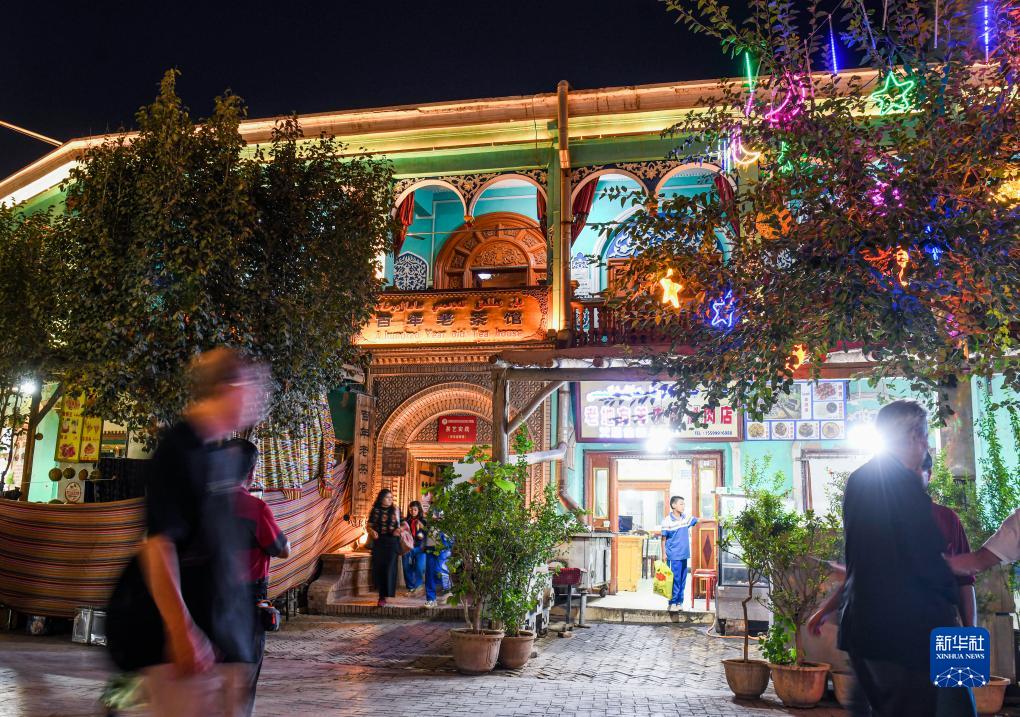 夜色中的新疆喀什古城百年老茶館(9月15日攝)。