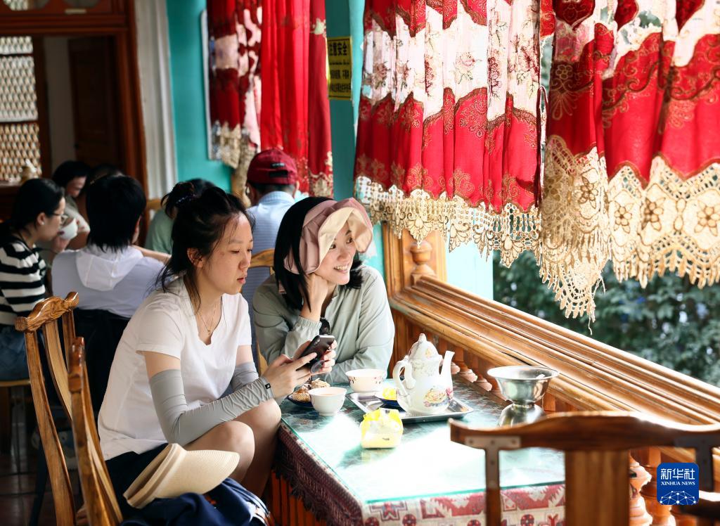 在新疆喀什古城百年老茶館內,游客在品茶休憩(9月7日攝)。