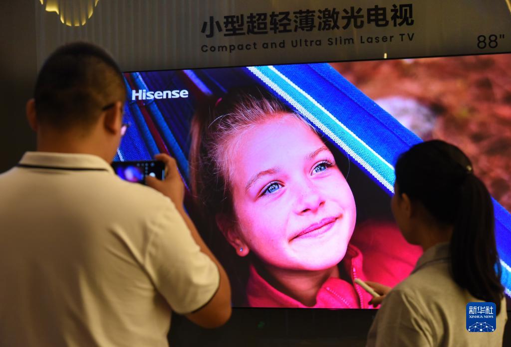 9月19日,參會者在激光顯示技術成果展示區觀看一款超輕薄激光電視。