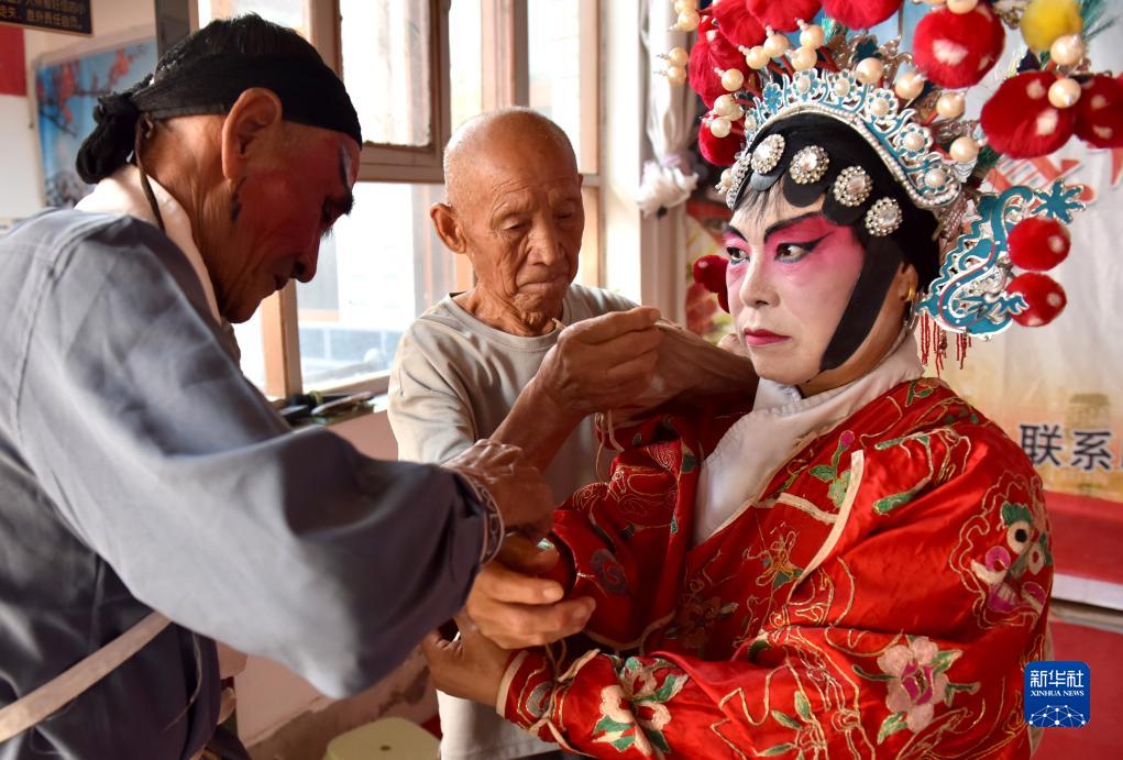 9月19日,威縣亂彈傳承人時敬華在排練前整理戲曲服飾。