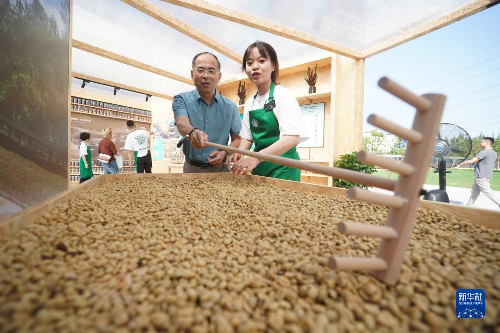 9月19日,在星巴克中國咖啡創新産業園開園儀式現場,來賓在體驗晾曬咖啡生豆。