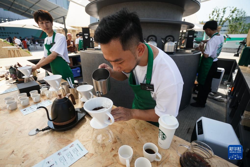 9月19日,在星巴克中國咖啡創新産業園開園儀式現場,工作人員製作咖啡。