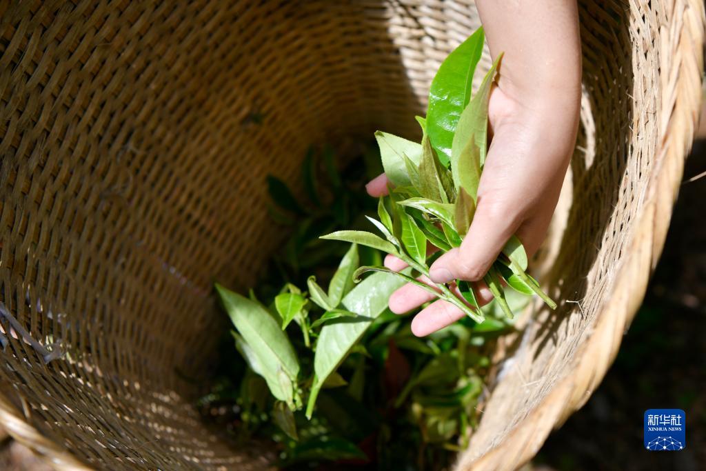 9月19日,景邁山翁基古寨的布朗族茶農玉炳把採摘的秋茶放入竹簍。