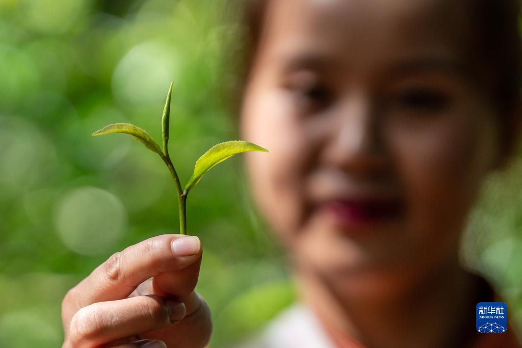 9月19日,景邁山翁基古寨的布朗族茶農小花展示採摘的秋茶。