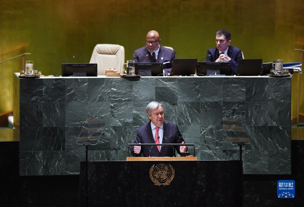 9月19日,在位於紐約的聯合國總部,聯合國秘書長古特雷斯(前)在第78屆聯合國大會一般性辯論開幕式上講話。