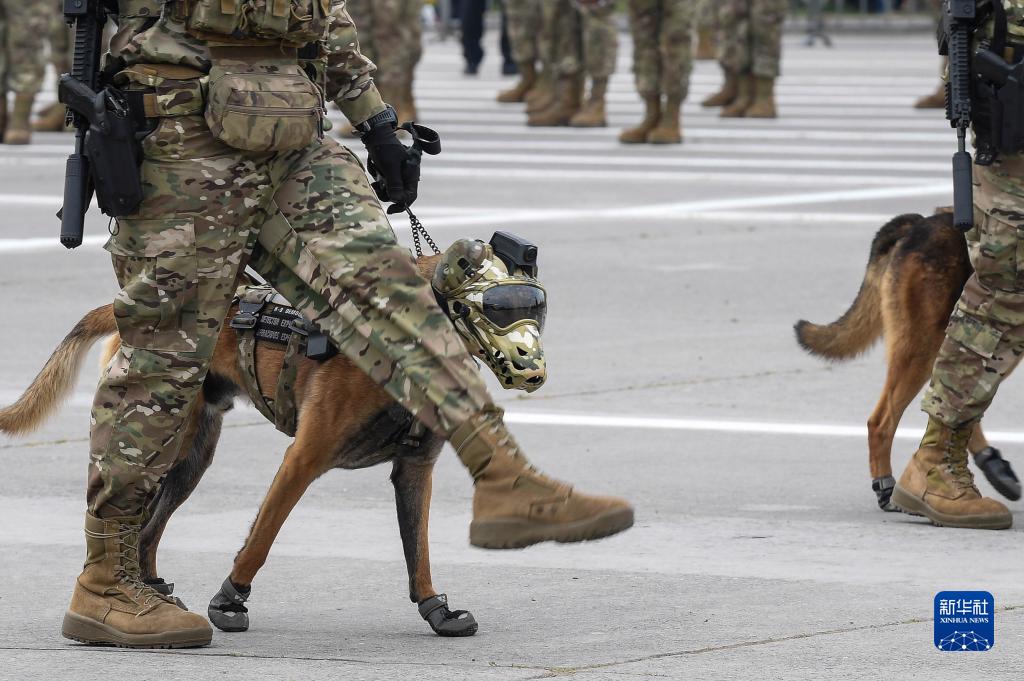 9月19日,在智利首都聖地亞哥,士兵攜帶軍犬參加閱兵式。