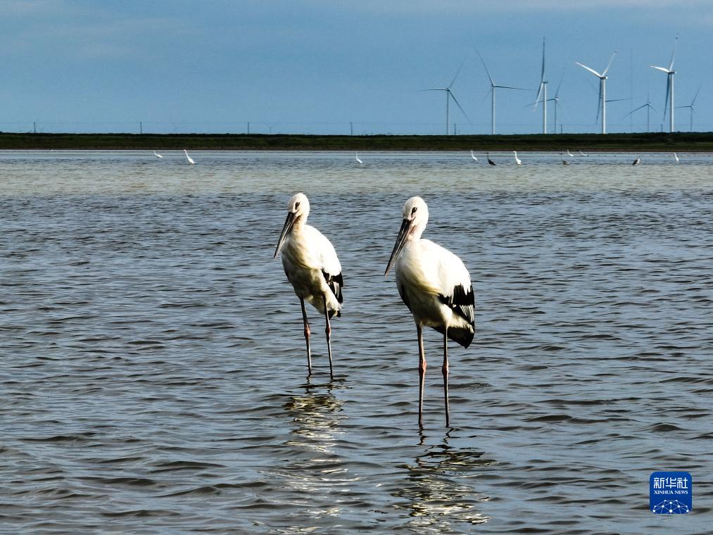 東方白鸛生活在鹽城東&條子泥濕地(8月31日攝,無人機照片)。