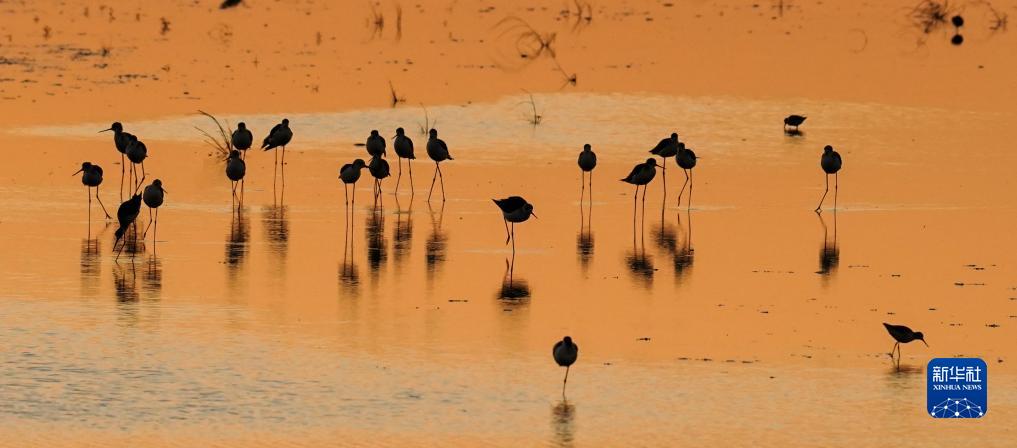 群鳥棲息在夕陽下的東&條子泥濕地(8月31日攝)。