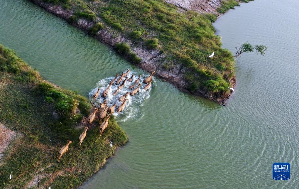 一群麋鹿在大豐麋鹿國家級自然保護區野鹿蕩渡河(8月20日攝,無人機照片)。