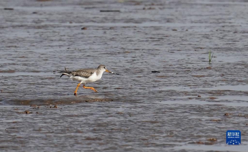 一隻翹嘴鷸在東&條子泥濕地灘塗上覓食(9月1日攝)。