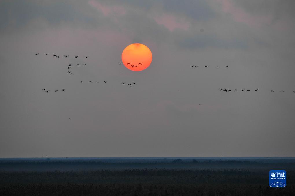 江蘇鹽城濕地珍禽國家級自然保護區日出景色(2022年11月8日攝)。