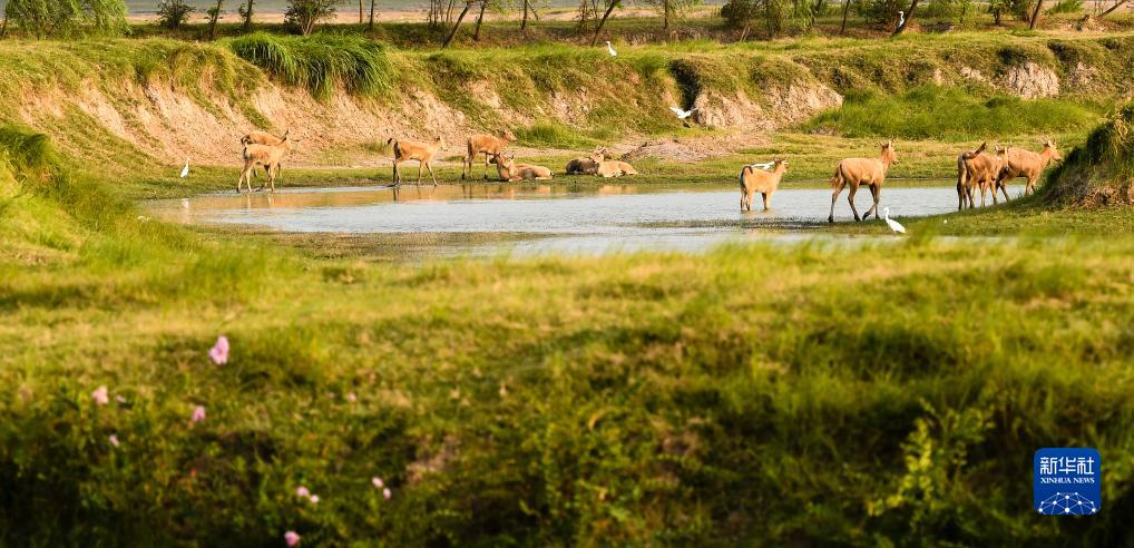 麋鹿生活在江蘇大豐麋鹿國家級自然保護區(8月20日攝,無人機照片)。