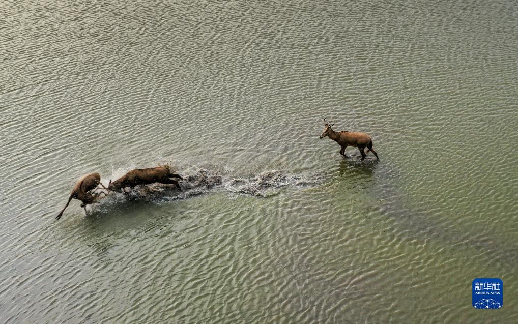麋鹿在大豐麋鹿國家級自然保護區野鹿蕩的水塘裏爭鬥(8月20日攝,無人機照片)。