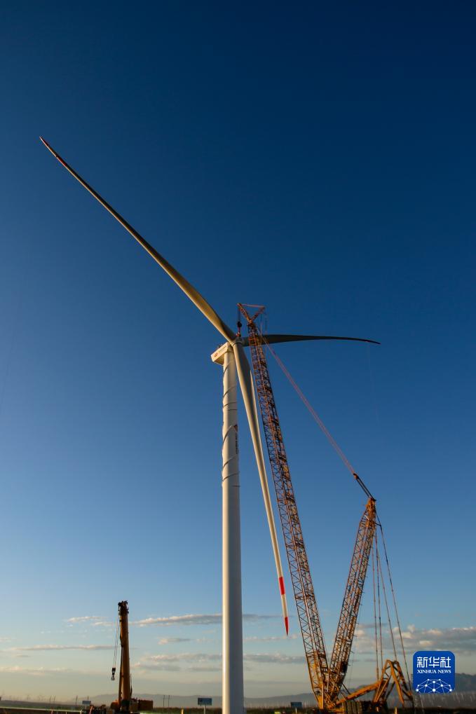 在新疆達坂城風電場拍攝的一台風力發電機組吊裝作業現場(8月4日攝)。