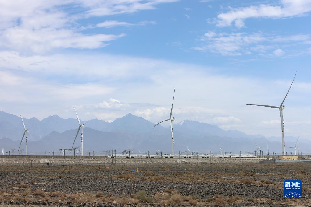 一輛列車駛過新疆達坂城風電場(8月3日攝)。