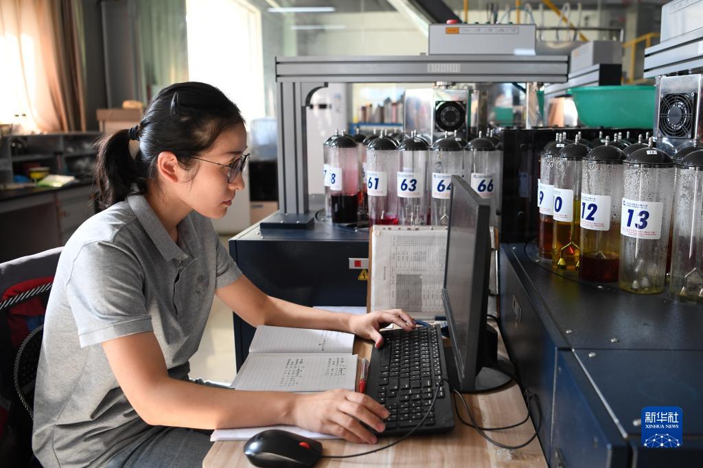 9月20日,安美橋(南宮)羊絨製品有限公司的工作人員在染料配比實驗室內工作。